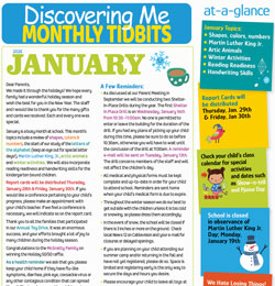 We made it through the holidays! We hope every family had a wonderful holiday season and wish the best for you in the New Year. The staff and I would like to thank you for the many gifts and cards we received. Each and every one was special. January is a busy month at school. This month’s topics include a review of shapes, colors & numbers, the start of our study of the letters of the alphabet (keep an eye out for special letter days!), Martin Luther King, Jr., arctic animals and winter activities. We will also incorporate reading readiness and handwriting skills for the kindergarten bound children.